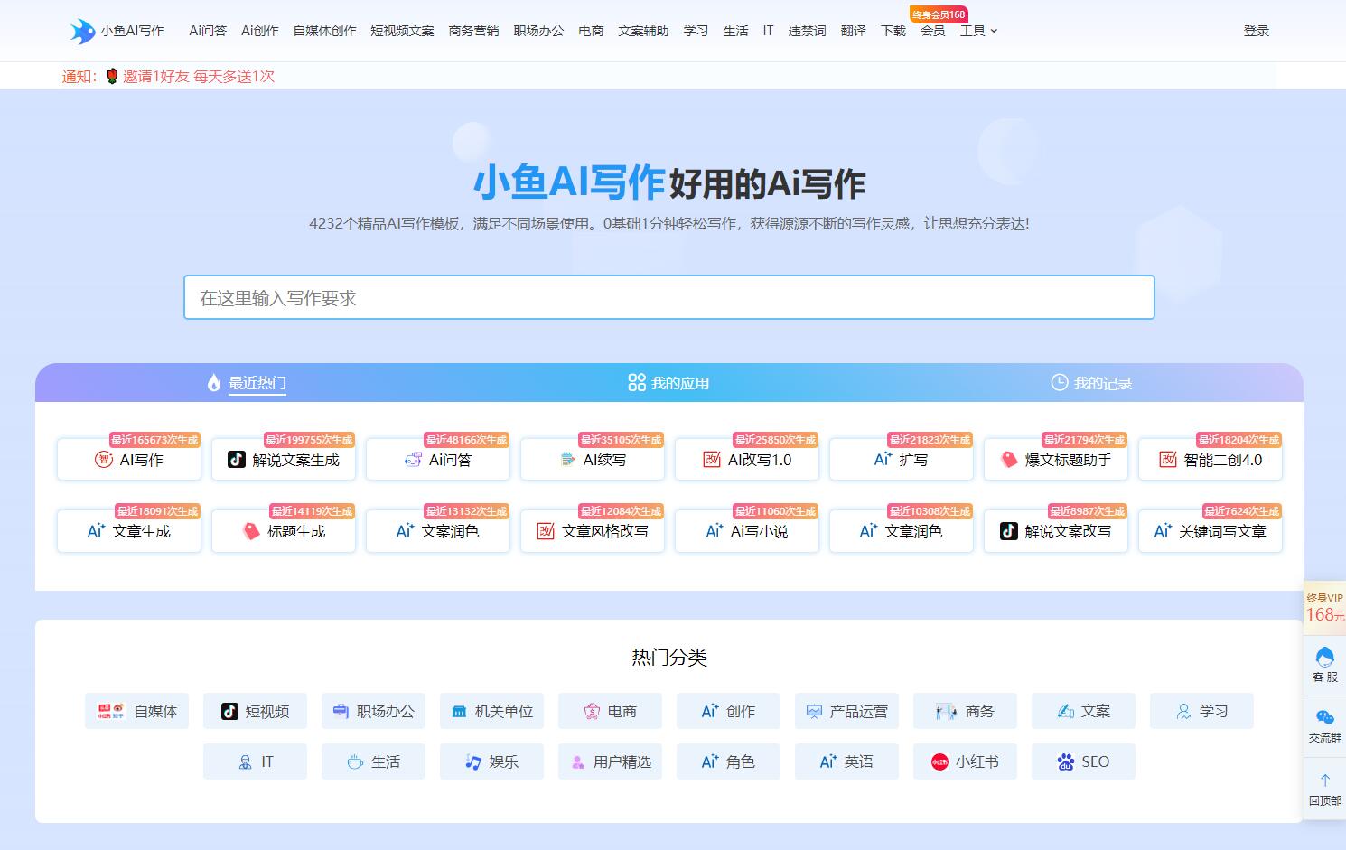 小鱼AI免费在线智能AI写作平台,AI自动生成高质量原创内容。不仅支持AI写作、AI续写、AI改写等功能。还涉及AI影视解说、爆款标题、AI知乎回答、短视频脚本、带货口播、办公文档自动写作、宣传文案写作、智能翻译、AI写小说、小红书笔记标题、种草文案、报告合同、计划规划、调研调查、简历招聘、产品方案、广告创意、营销策划、工作汇报等功能。满足不同职业、人群的写作创作需求,让写作更简单,让思想充分表达!